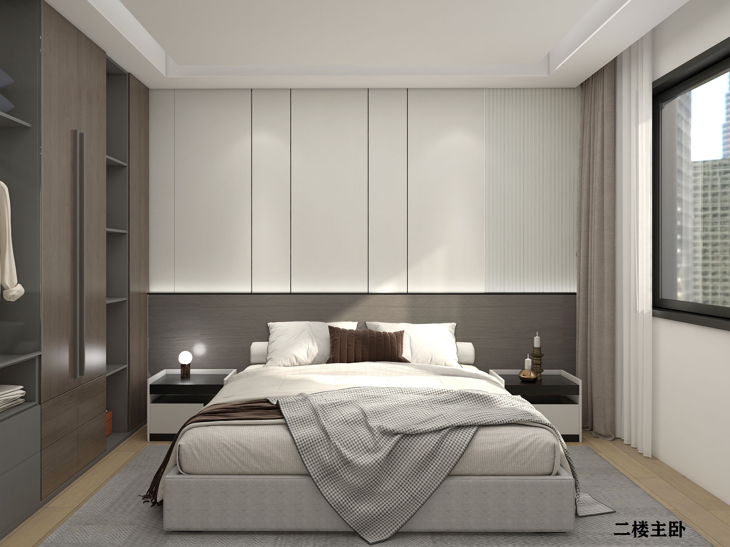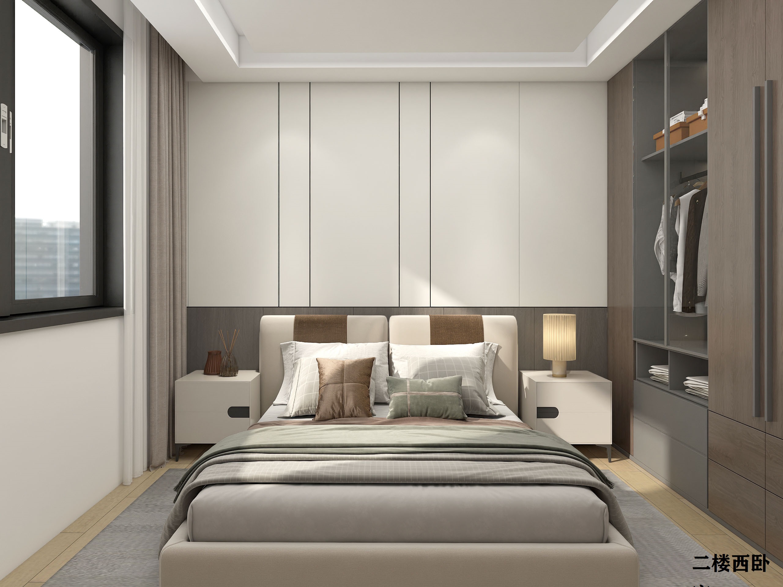 臥室空間簡潔自然,床頭背景墻沿用客廳主色莫蘭迪灰,下置木質魚骨紋飾面板的組合設計,增加空間層次感,側邊融入木格柵裝飾,整個設計簡潔利落,沒有過多的裝飾,依靠空間感和材料本身,凸顯出整個設計的氣質。