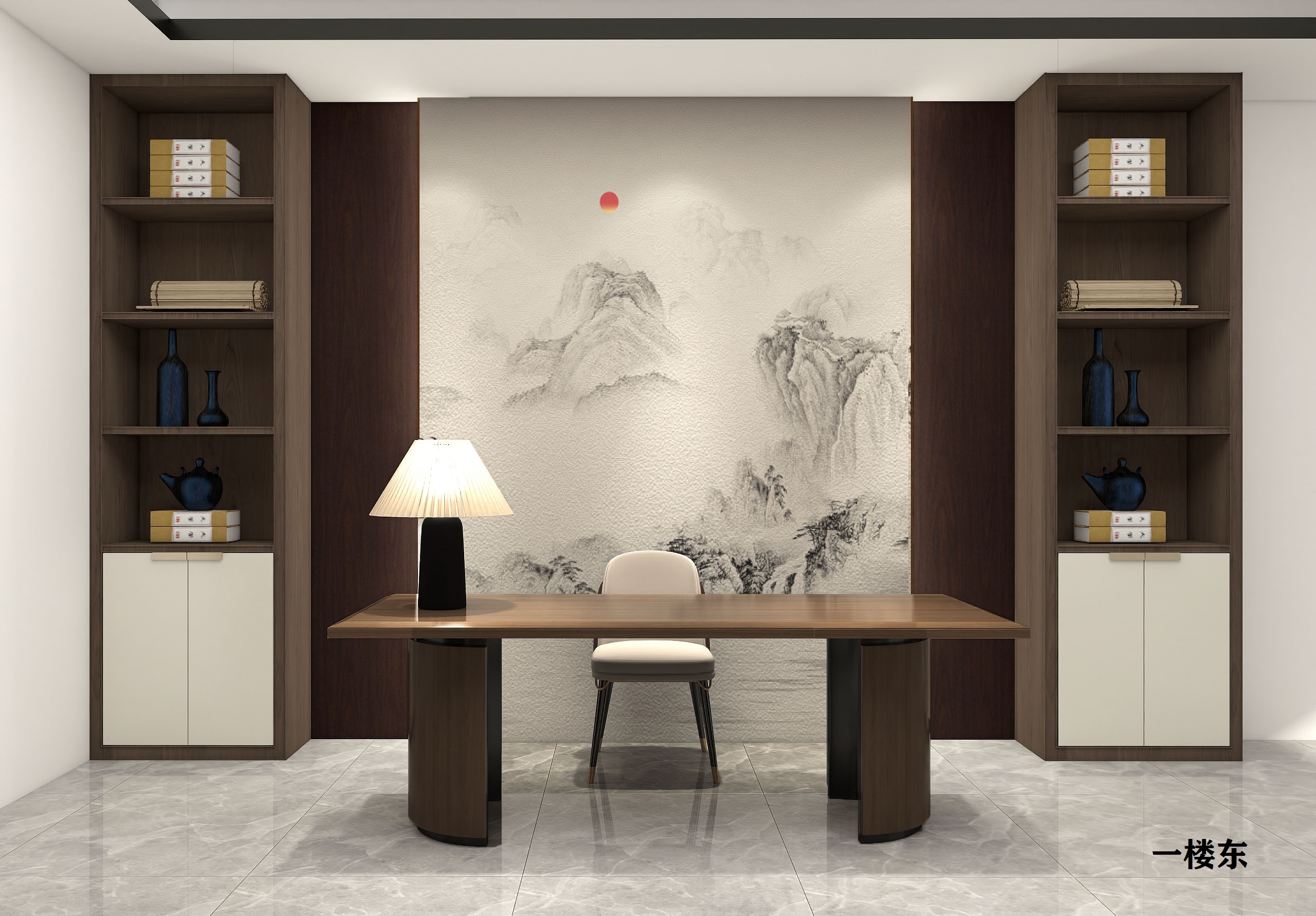 在時代的背景下,新中式書房尊重傳統,又不固守傳統,書房選用水洗橡木色護墻板,造型頗具新中式的洗練和硬朗,背景墻以大面積的5D山水打印畫作為裝飾元素,形成呼應和諧,空間對稱的結構、材質的運用及裝飾陳列都體現出中式的韻味和儀式感。