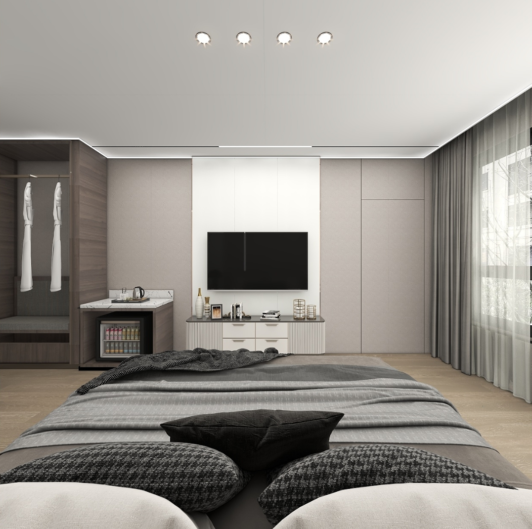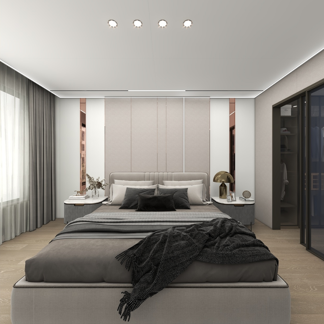主臥以灰色系為基調,莫蘭迪灰+串珠布紋集成墻板搭配深棕色床品,營造一個出精致又典雅的睡眠空間。