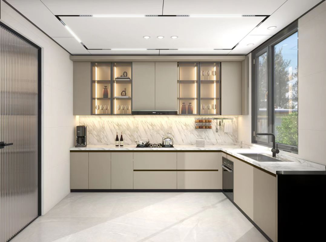 不同材質、色彩的板材拼接做出層次,再以裝飾畫、射燈、線燈裝飾點綴,輕奢中卻有著十足的氛圍感。