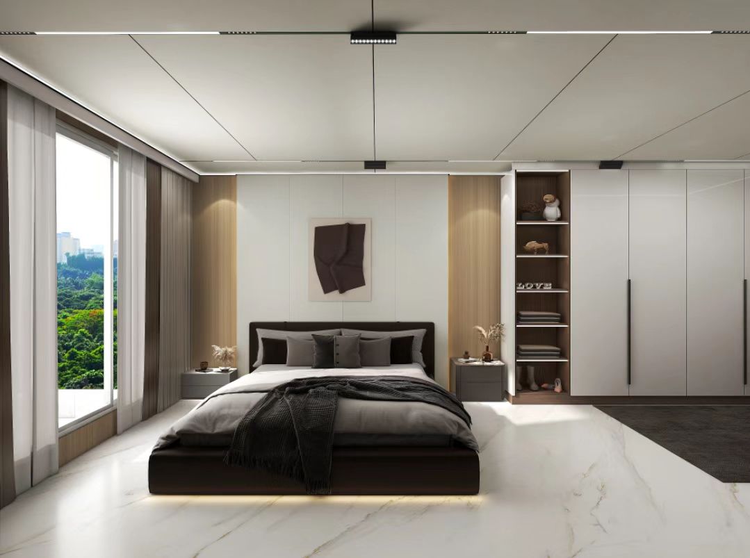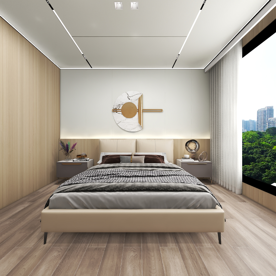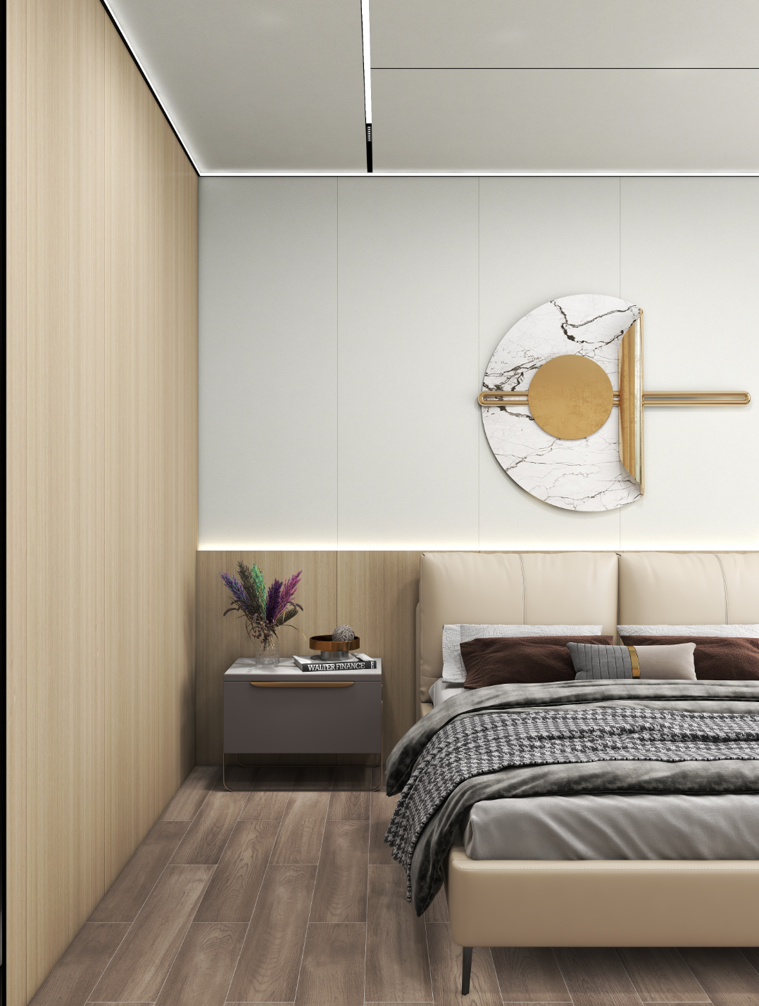 營造寧靜與靜謐的臥室氣氛,一明一暗的純白與原木色,用最簡單的色塊將臥室的輪廓勾勒出來,借由動人的生活細節(jié),不著痕跡地將舒適彌散而來。