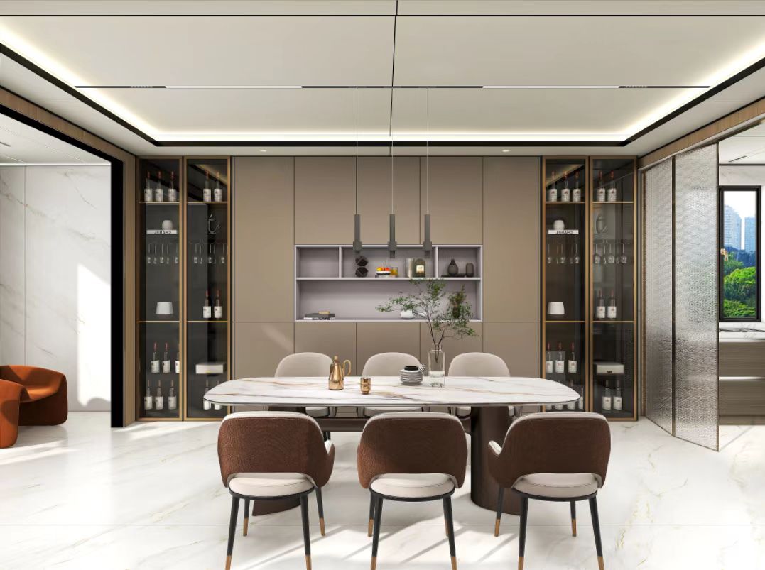 利用吊頂劃分兩個空間,餐廳蜂窩大板的無主燈設計讓空間更加通透,更凸顯層次感。桌椅恰到好處的層級色差,形成不俗的設計張力,大面積的窗外美景,為室內帶來和諧的清新雅調。