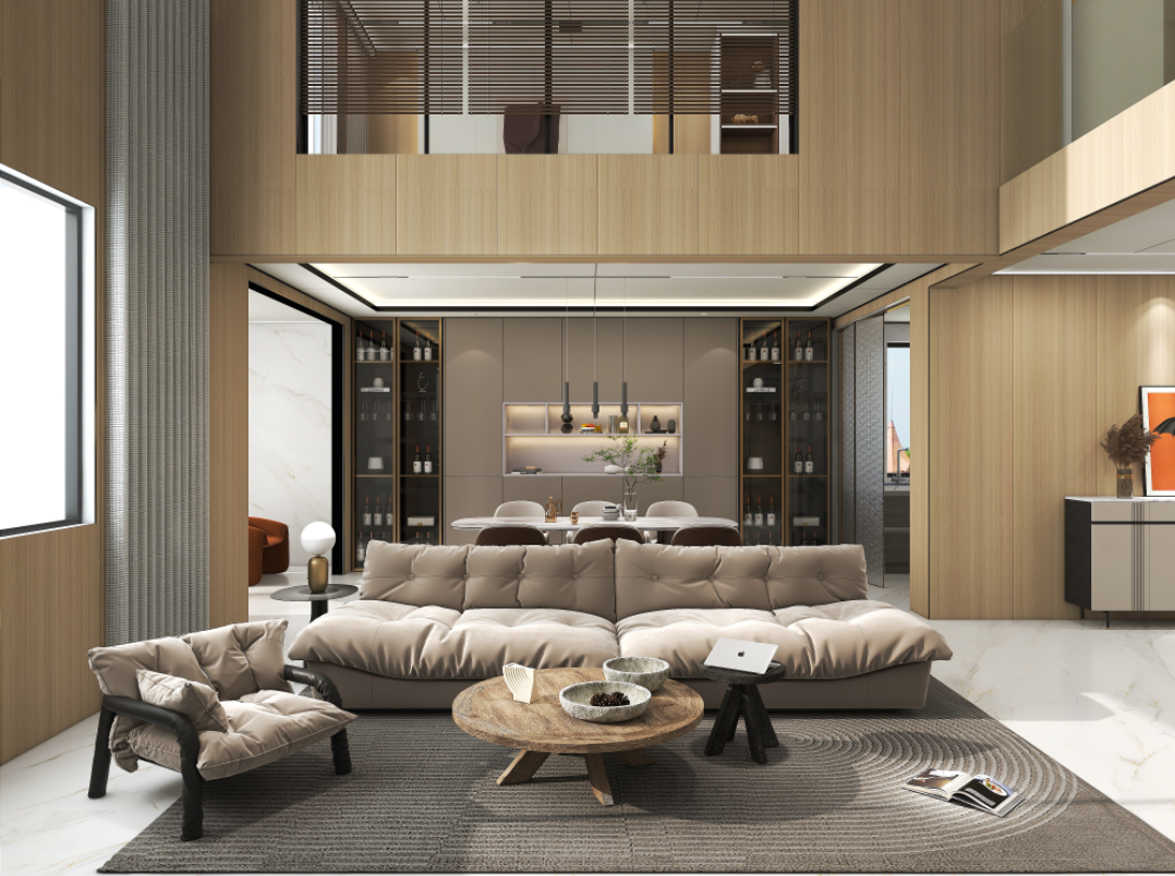 在設計重點上,選用溫潤柔和的星雅圖原木色木紋飾面和牡蠣白飾面,避免鮮艷的配色;設計師結合戶型特點與需求,不斷地做減法空間設計,除了舒適的比例,更是強調交互與體驗,創(chuàng)造出和諧共生的自然美宅。