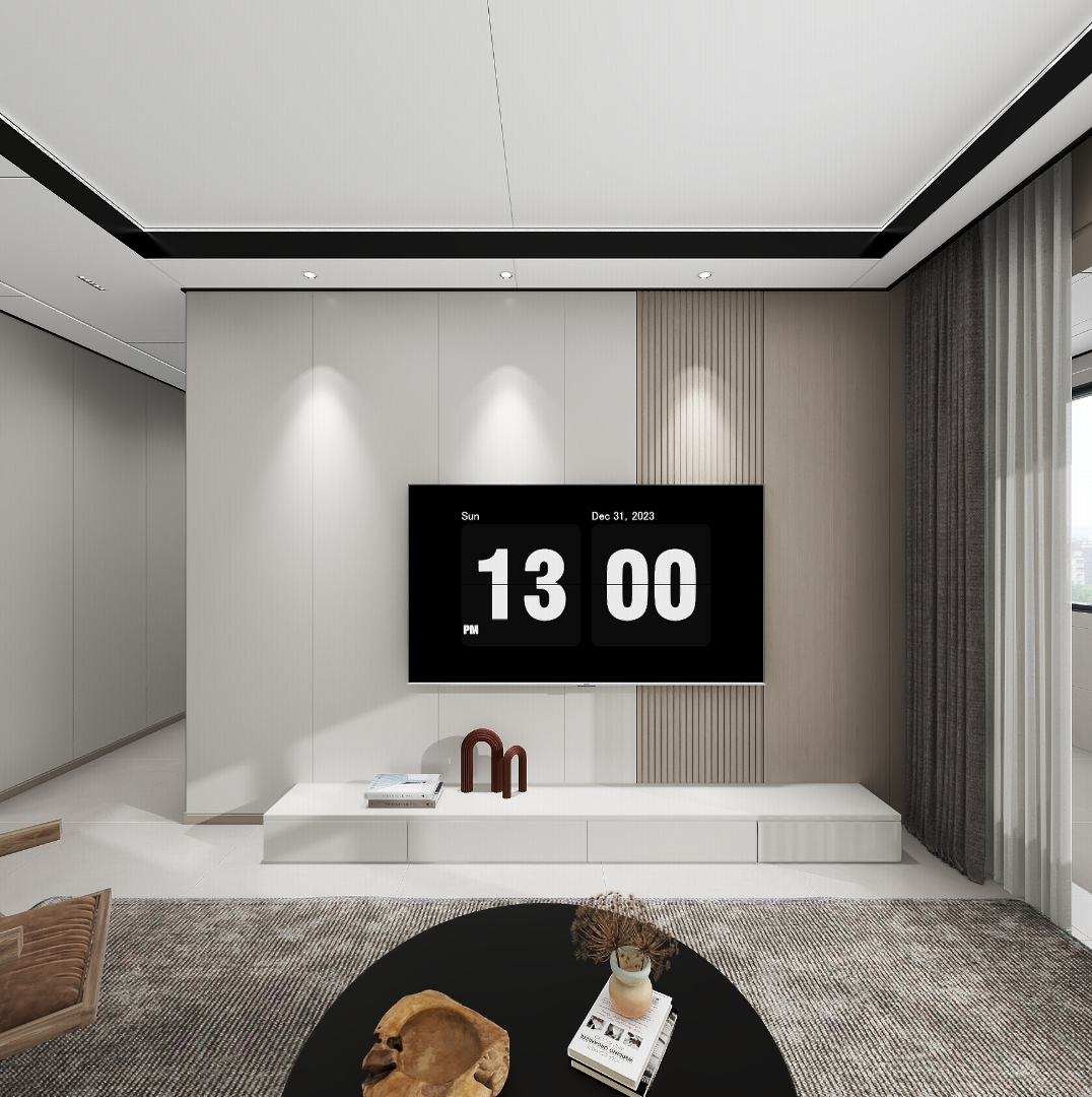 電視背景墻選用沙發同色子午灰搭配加拿大淺色胡桃,干凈的顏色與色塊,都讓空間呈現出利落觀感。